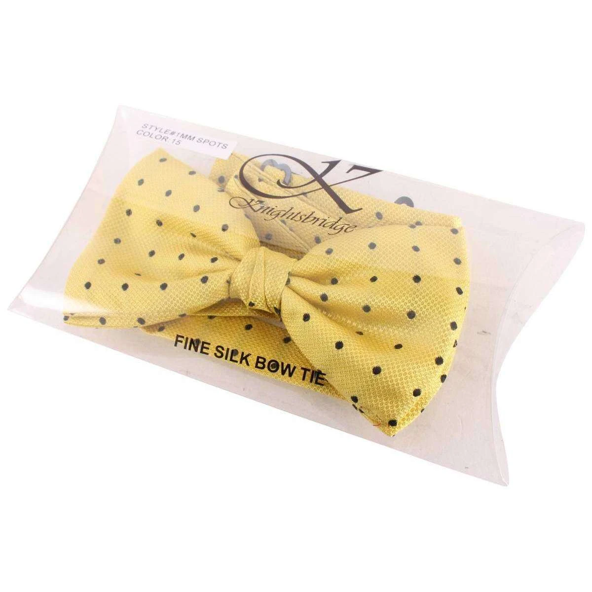 The perfect addition to any fashionable mans attire, this exquisite bow tie by Knightsbridge Neckwear is sure to please. Featuring a beautiful, classic spotted design in black and yellow this neck piece will also add a dash of subtle colour to your outfit. Skilfully crafted from the finest of silk you are sure to get a fine, luxury accessory that will last for years to come. Knightsbridge Neckwears spots silk bow tie features and adjustable neck strap so youre sure to get a perfect fit. Coming complete in a Knightsbridge Neckwear presentation box, this luxurious bow tie will certainly make a thoughtful gift.