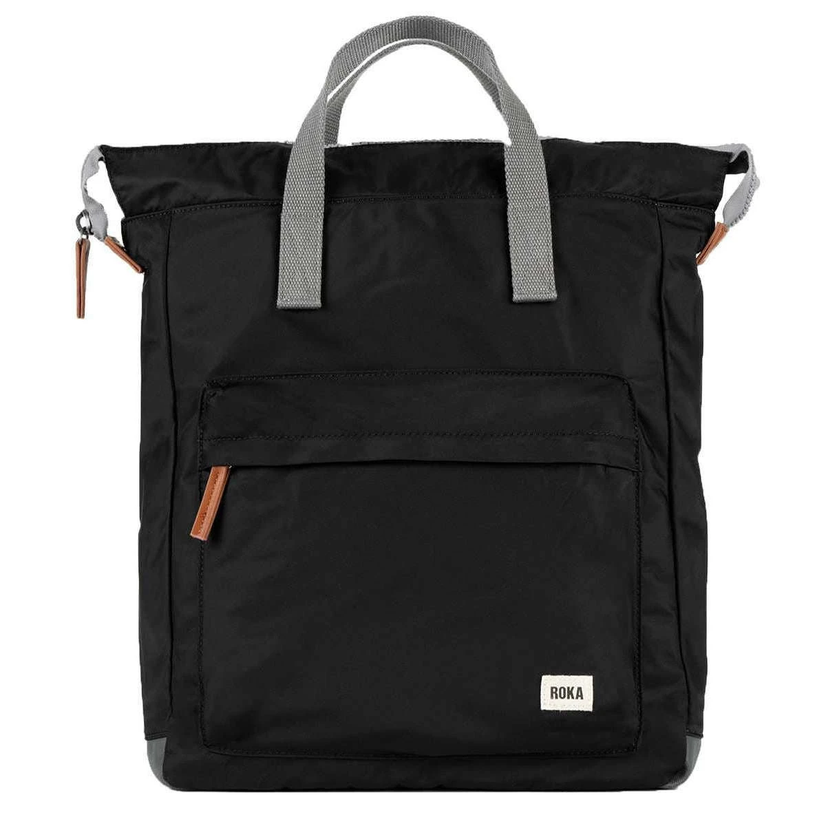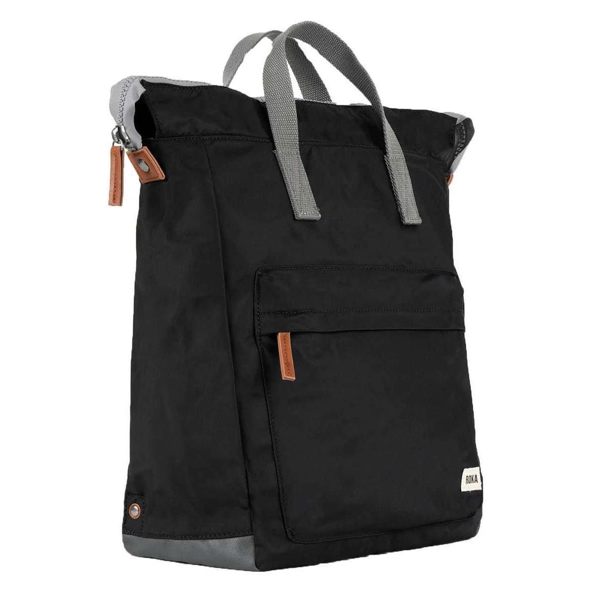 This unisex bantry b large sustainable nylon backpack has been made from 100% weather resistant recycled nylon (triple coated), featured in a black colour and is from the brand Roka. It measures 44.5cm(height) x 32cm(width) x 15cm(depth). All the bags come complete with roka packaging. The Roka Bantry B Large Sustainable Nylon Backpack – Black is the perfect weather resistant, lightweight backpack for your precious laptop or tablet. The padded compartment secures and protects your devices. The front zipped pocket holds commonly used items, while the small personal pocket secures smaller items. This original backpack features 4 straps for comfortable carrying on your back or by your side, and features a padded back for ensured back comfort. This durable and comfortable to carry pack is ready to take you on all types of activities. Twelve or more plastic bottles are used to make the rPet Materials used in the construction of this bag so you can be sure it is sustainable, environmentally friendly and completely vegan.