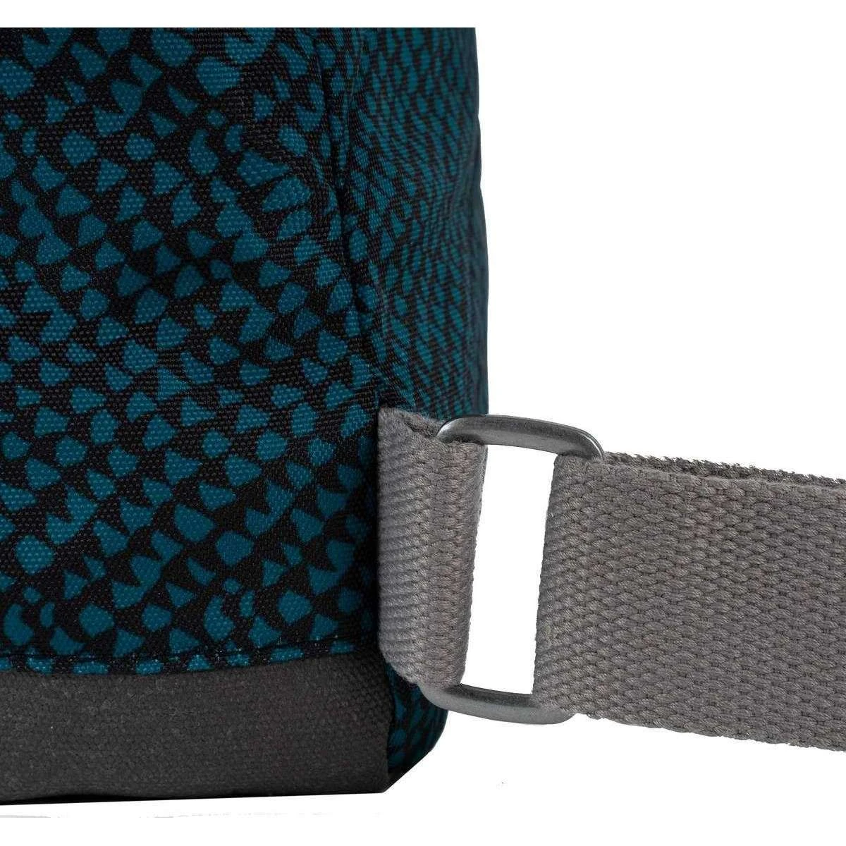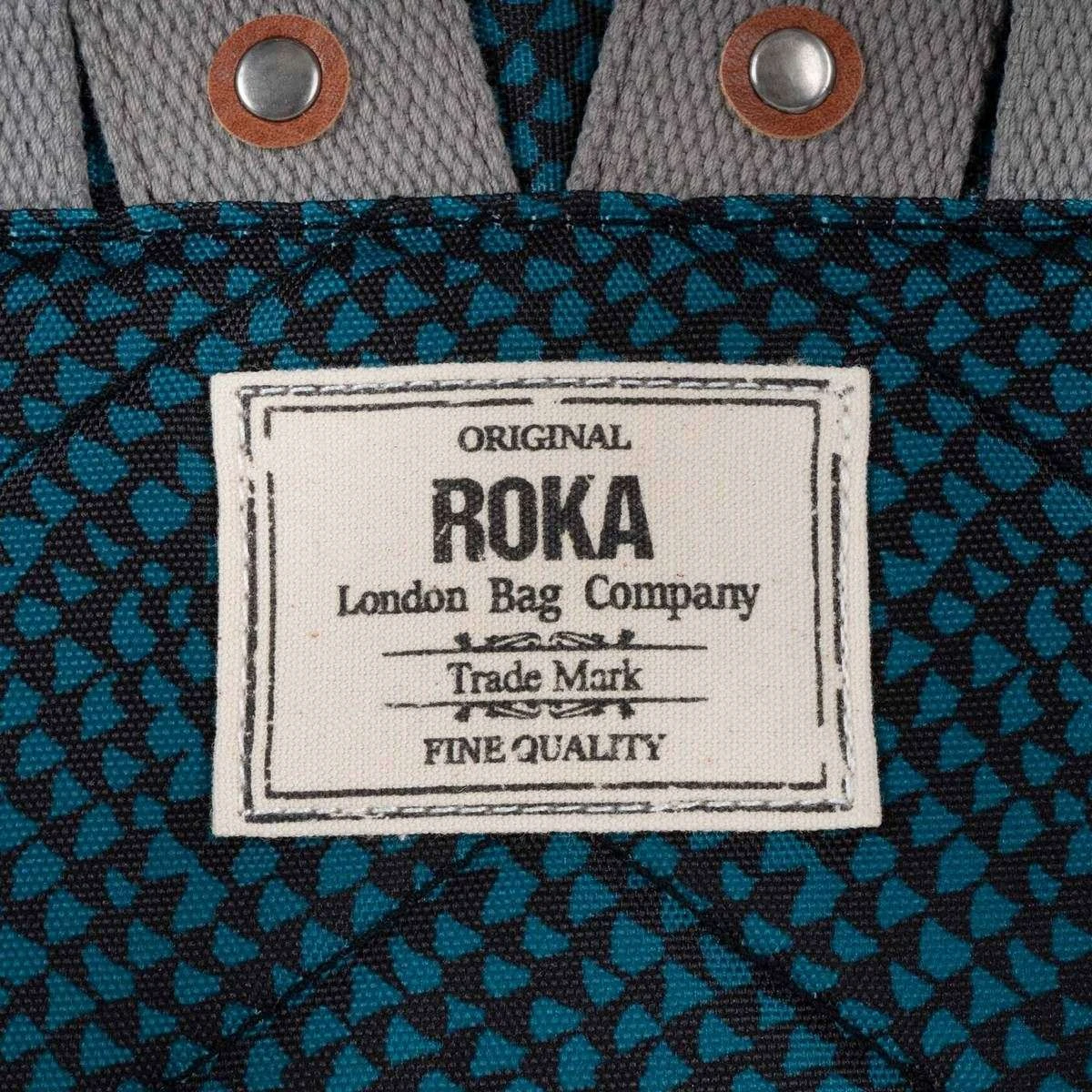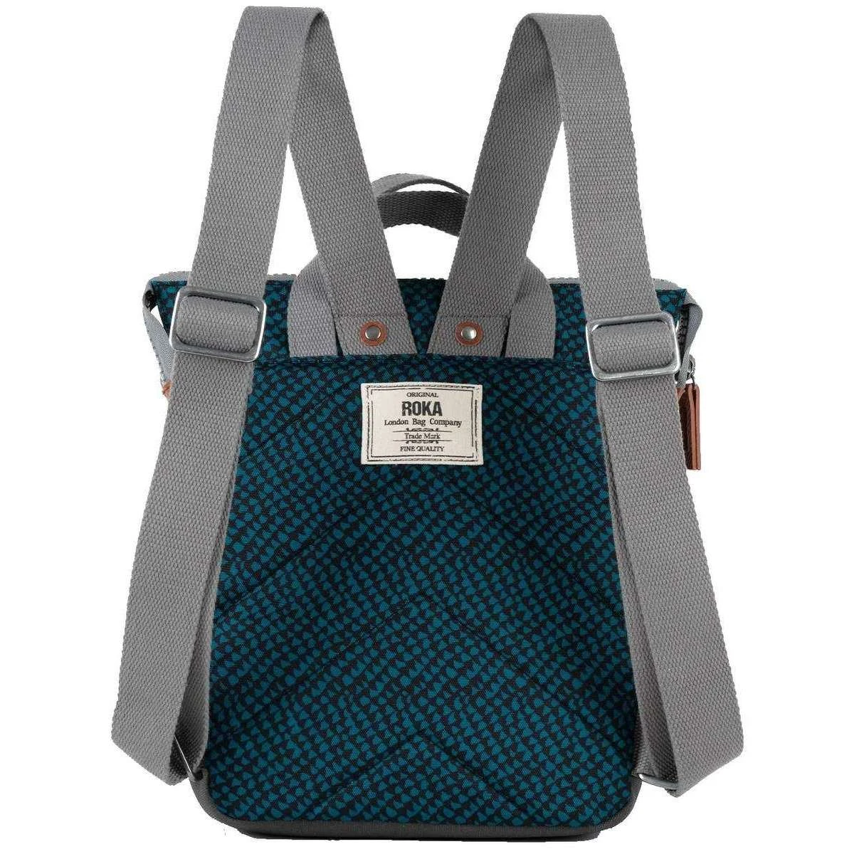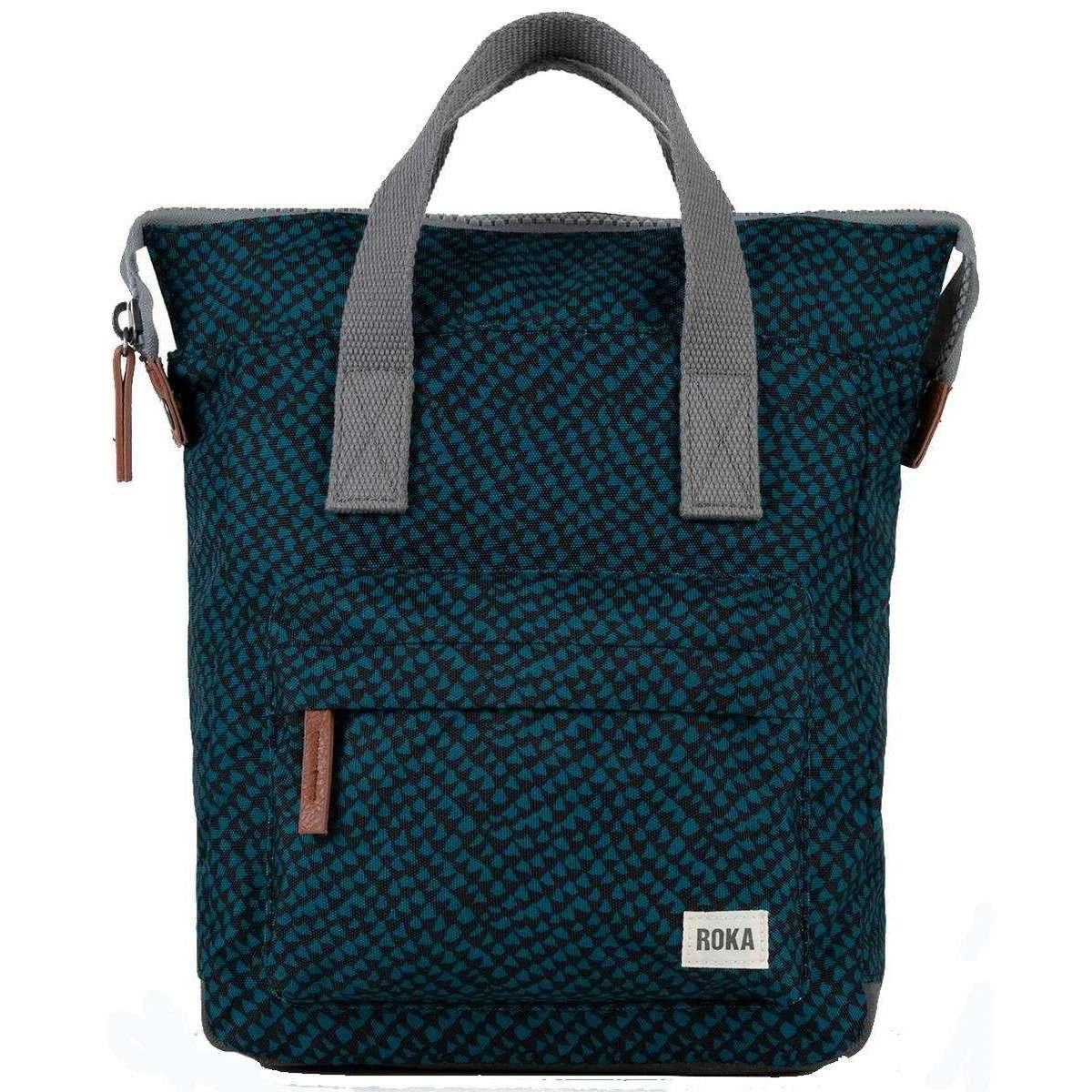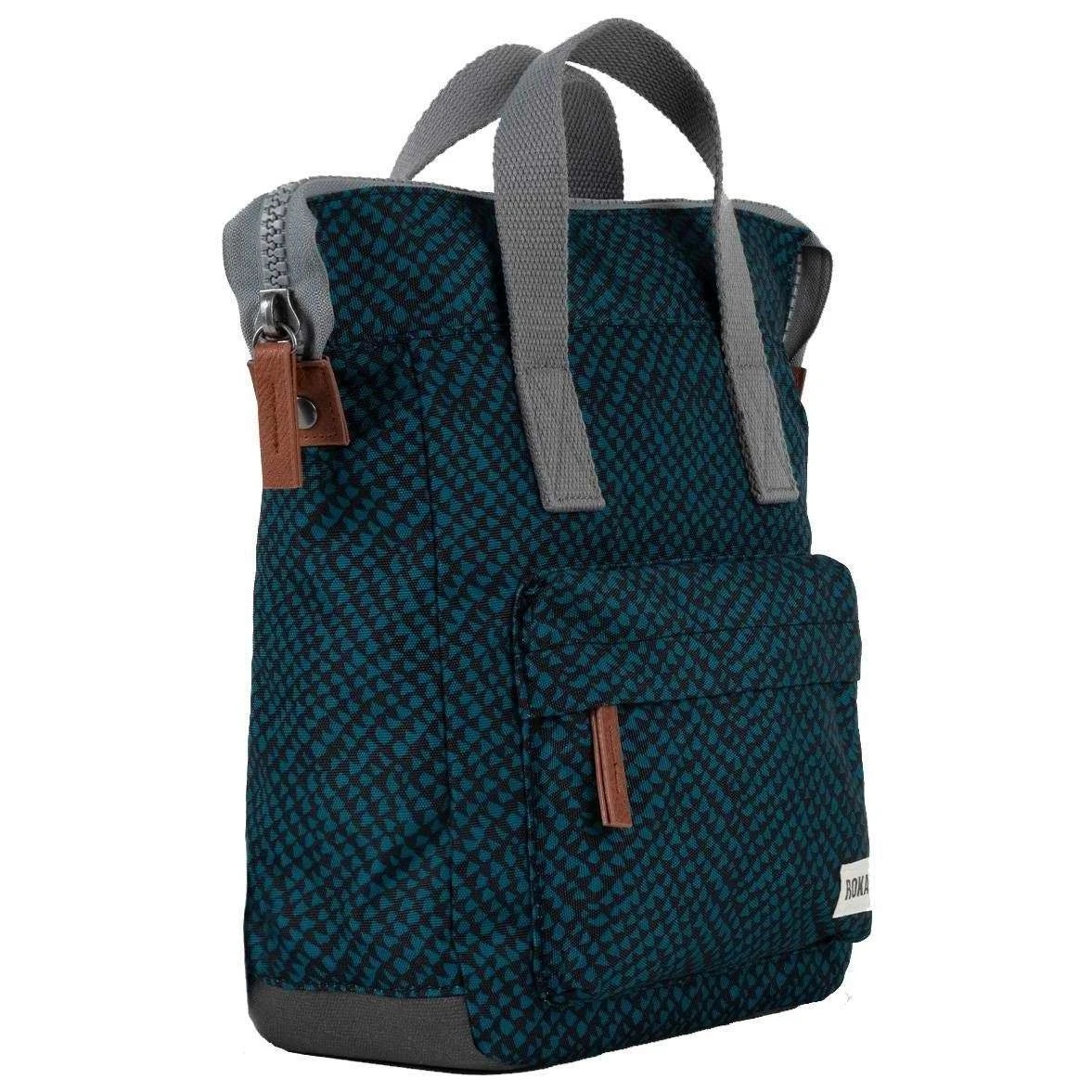 This unisex bantry b small snake print sustainable canvas backpack by the brand Roka is made from 100% weather resistant recycled canvas (triple coated) and is showcased in blue. It measures 32cm(height) x 26cm(width) x 10cm(depth). All the bags come complete in roka packaging. The Roka Bantry B Small Snake Print Sustainable Canvas Backpack – Deep Teal Blue front zipped pocket is just the right size for those items that need to be kept handy. This backpack has been manufactured from 12 to 15 recycled bottles making a difference in the world one step at a time. Being weather resistant and durable, this can be taken around in any weather to hold all your essentials, even precious ones with its padded inside pocket and zipped compartment. There are two ways to carry as it features 4 straps, 2 of which can be adjusted. Finished with a charismatic snake print design, this bag is an all-round must have.