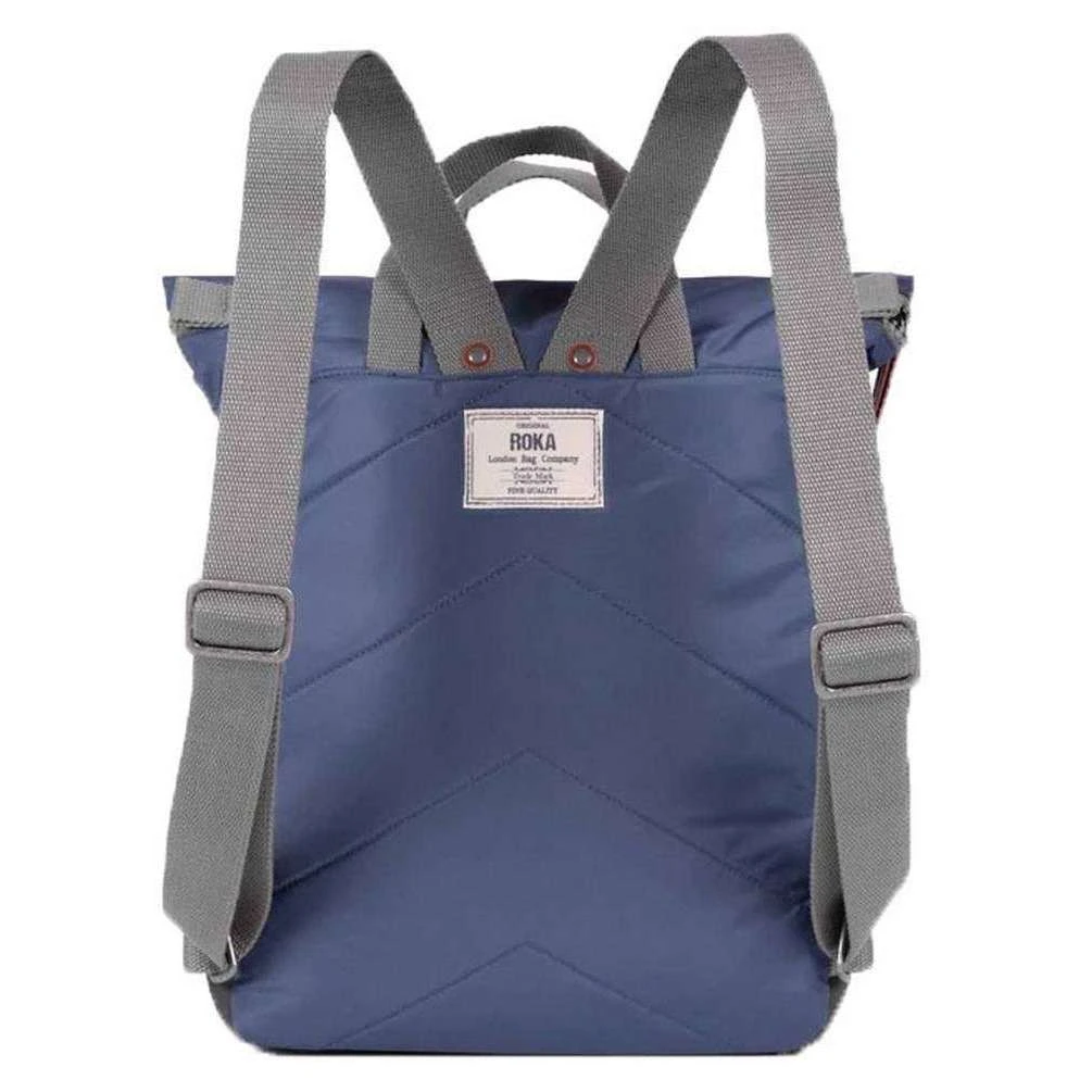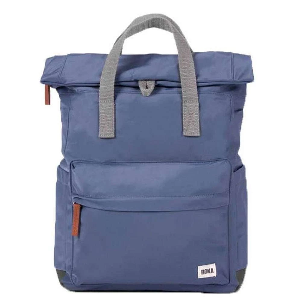 This unisex canfield b medium sustainable nylon backpack by the brand Roka is made from 100% weather resistant recycled nylon (triple coated) and is showcased in blue. It measures 42cm(height) x 30cm(width) x 12cm(depth). All the bags come complete with roka packaging. The Roka Canfield B Medium Sustainable Nylon Backpack – Airforce Blue is weather-resistant, durable, lightweight and sleek. Excellently crafted from recycled rPET materials, 12 or more plastic bottles are used to create this backpack making it environmentally friendly and sustainable. The roll top design enables the backpack to have a wide mouth opening which is secured with a sturdy zip and magnetic hold, carrying your essentials couldn’t be safer. Featuring a secret wallet pocket, a padded 15” laptop compartment, two side pockets perfect for water bottles, this backpack allows you to carry everything you may need on your day-to-day travels. Carry in complete comfort with the adjustable cotton webbing straps or the twin carry handles. This bag is completely vegan.