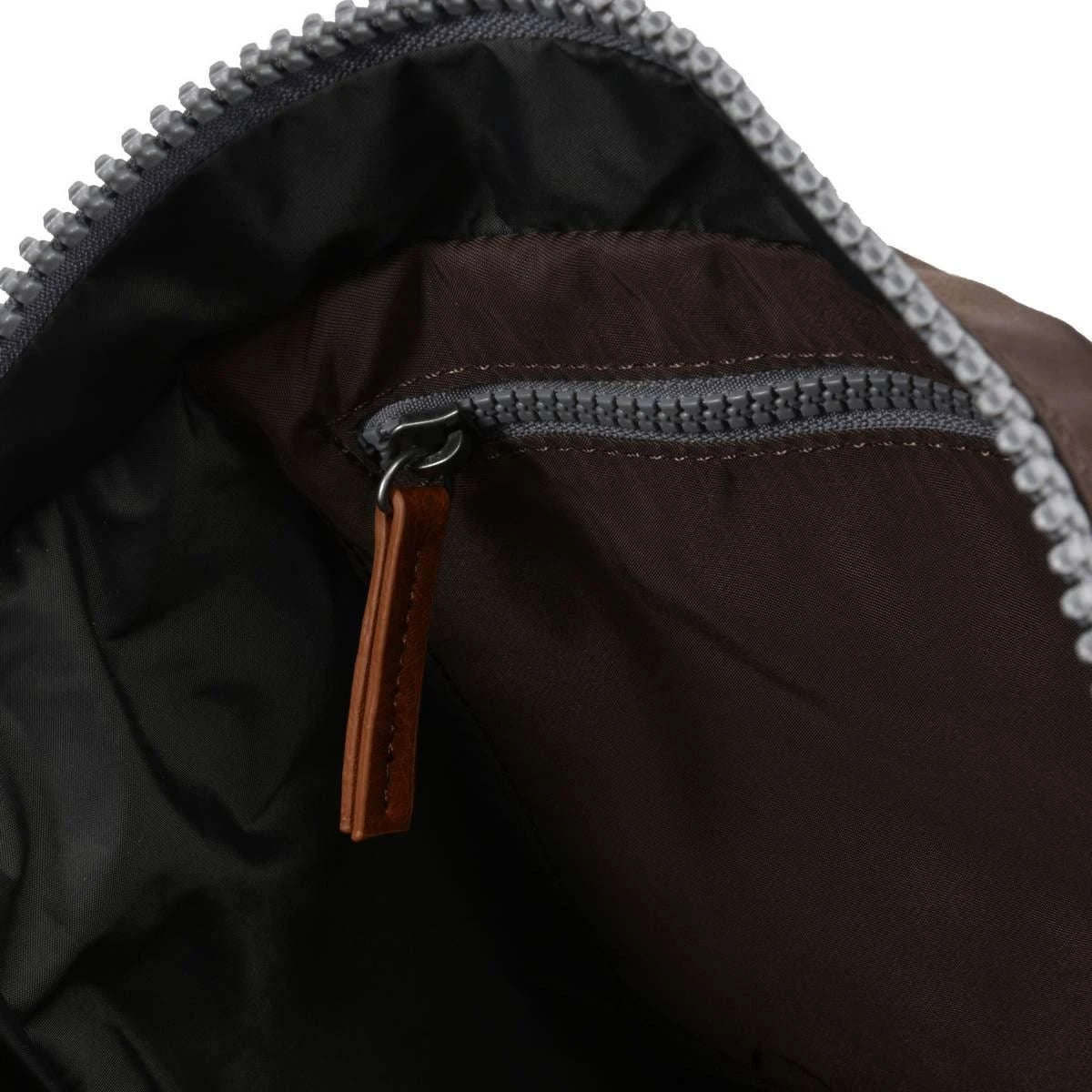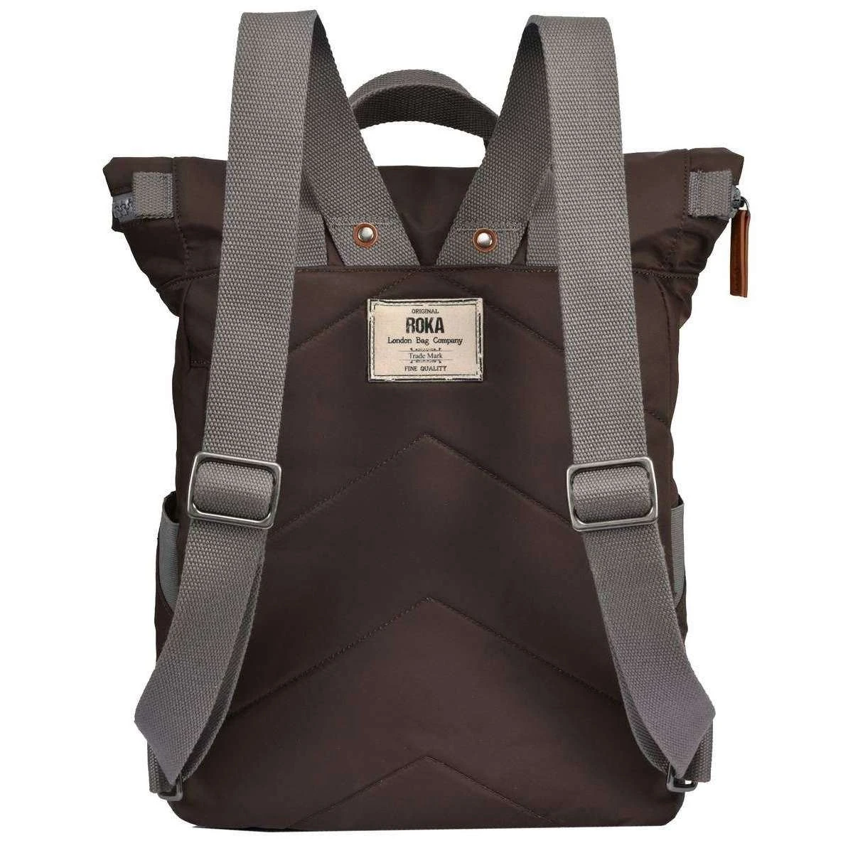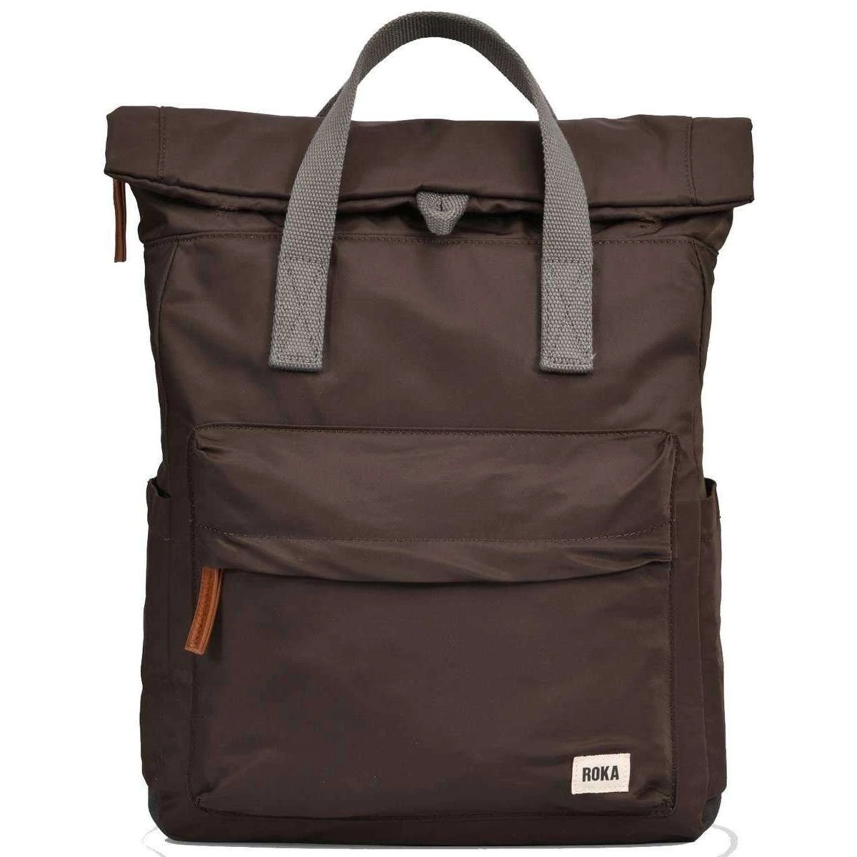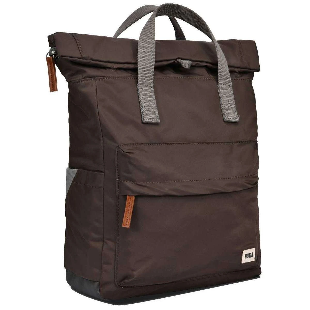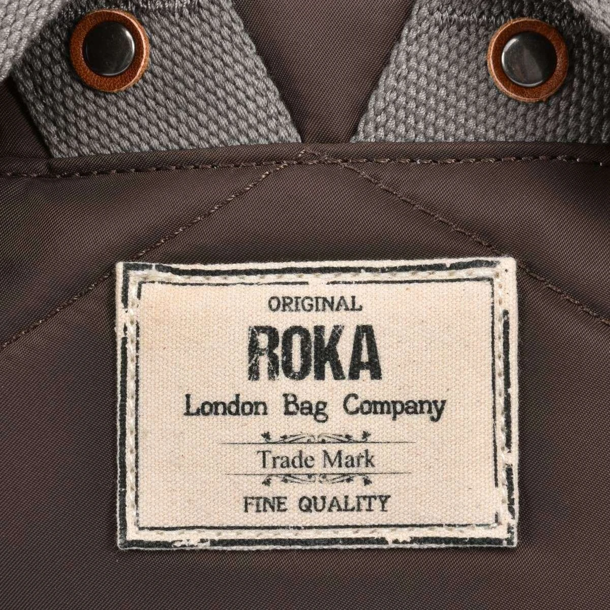 This unisex canfield b medium sustainable nylon backpack has been made from 100% weather-resistant recycled nylon (triple coated), featured in a brown colour and is from the brand Roka. It measures 42cm(height) x 30cm(width) x 12cm(depth). All the bags come complete in roka packaging. The Roka Canfield B Medium Sustainable Nylon Backpack – Dark Chocolate Brown is weather-resistant, durable, lightweight and sleek. Excellently crafted from recycled rPET materials, 12 or more plastic bottles are used to create this backpack making it environmentally friendly and sustainable. The roll top design enables the backpack to have a wide mouth opening which is secured with a sturdy zip and magnetic hold, carrying your essentials couldn’t be safer. Featuring a secret wallet pocket, a padded 15” laptop compartment, two side pockets perfect for water bottles, this backpack allows you to carry everything you may need on your day-to-day travels. Carry in complete comfort with the adjustable cotton webbing straps or the twin carry handles. This bag is completely vegan.