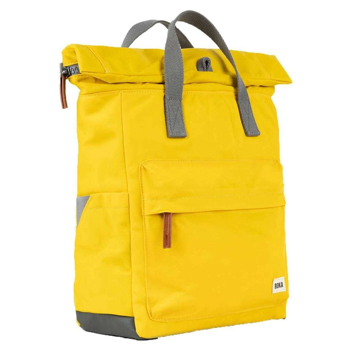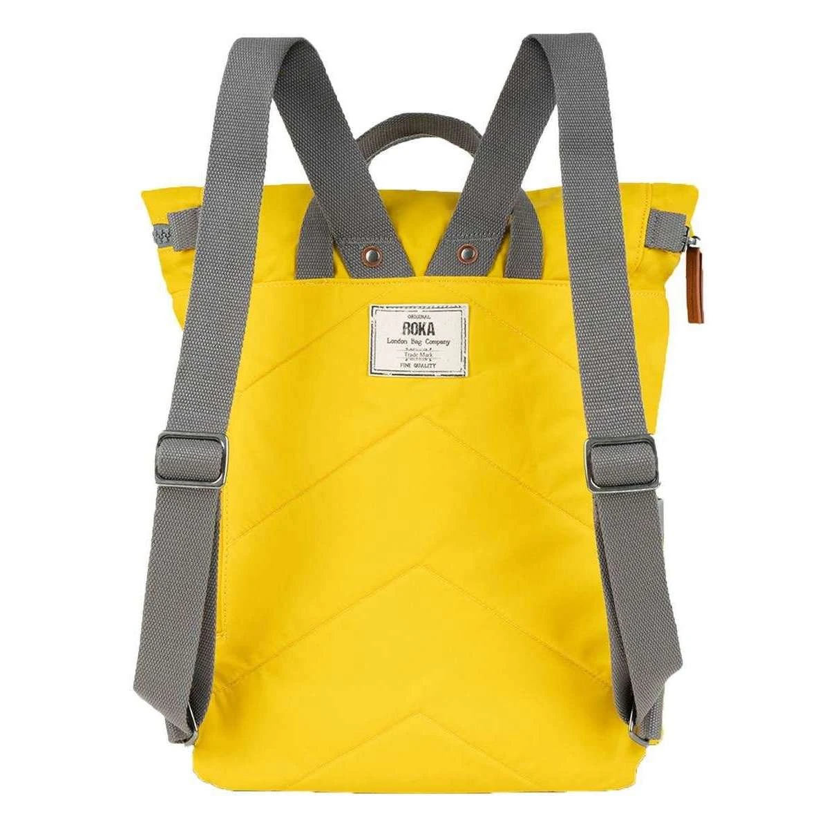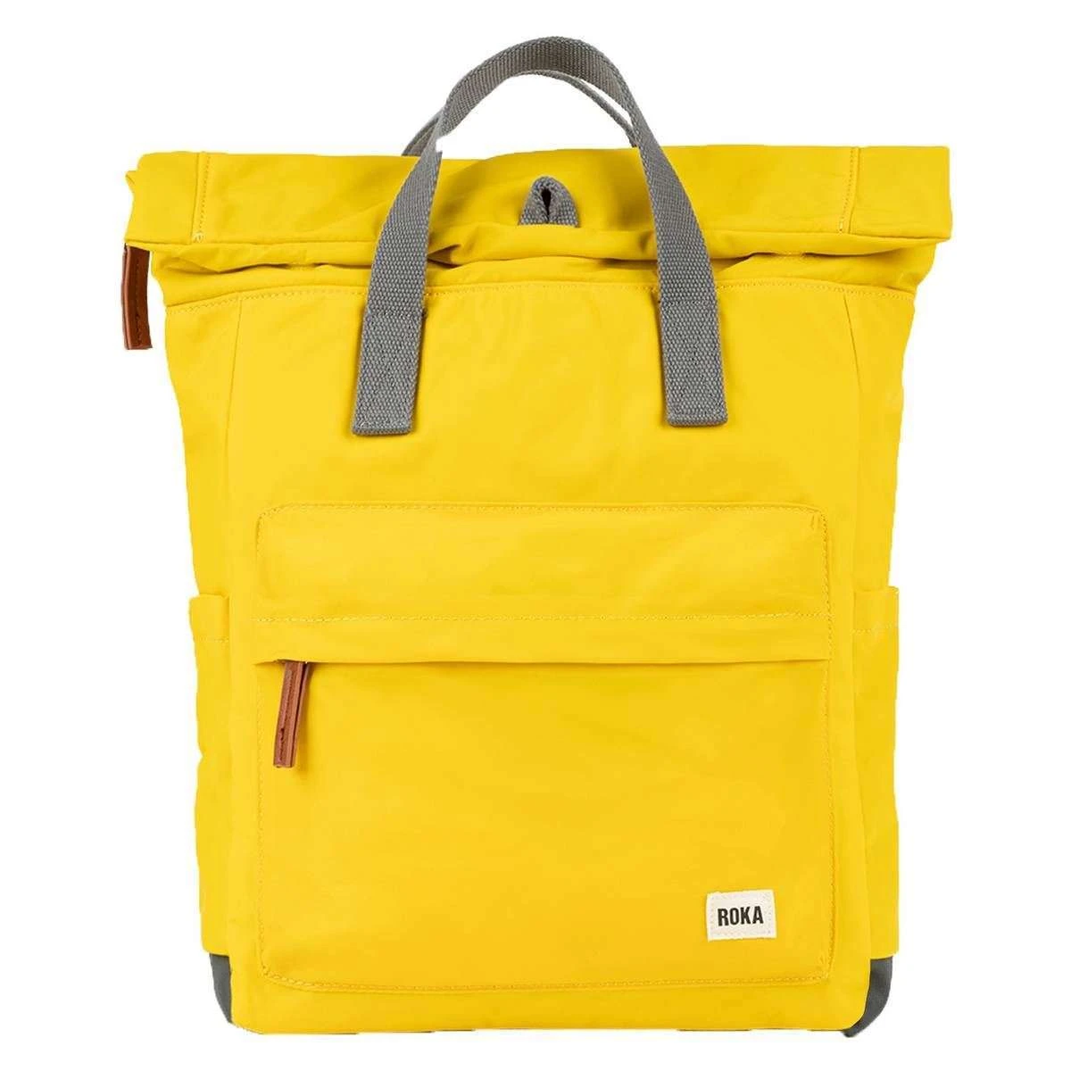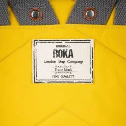 Using yellow 100% weather resistant recycled nylon (triple coated), this canfield b medium sustainable nylon backpack by Roka is perfect for men or women and a must have. It measures 42cm(height) x 30cm(width) x 12cm(depth). All the bags come complete with roka packaging. The Roka Canfield B Medium Sustainable Nylon Backpack – Mustard Yellow is weather-resistant, durable, lightweight and sleek. Excellently crafted from recycled rPET materials, 12 or more plastic bottles are used to create this backpack making it environmentally friendly and sustainable. The roll top design enables the backpack to have a wide mouth opening which is secured with a sturdy zip and magnetic hold, carrying your essentials couldn’t be safer. Featuring a secret wallet pocket, a padded 15” laptop compartment, two side pockets perfect for water bottles, this backpack allows you to carry everything you may need on your day-to-day travels. Carry in complete comfort with the adjustable cotton webbing straps or the twin carry handles. This bag is completely vegan.