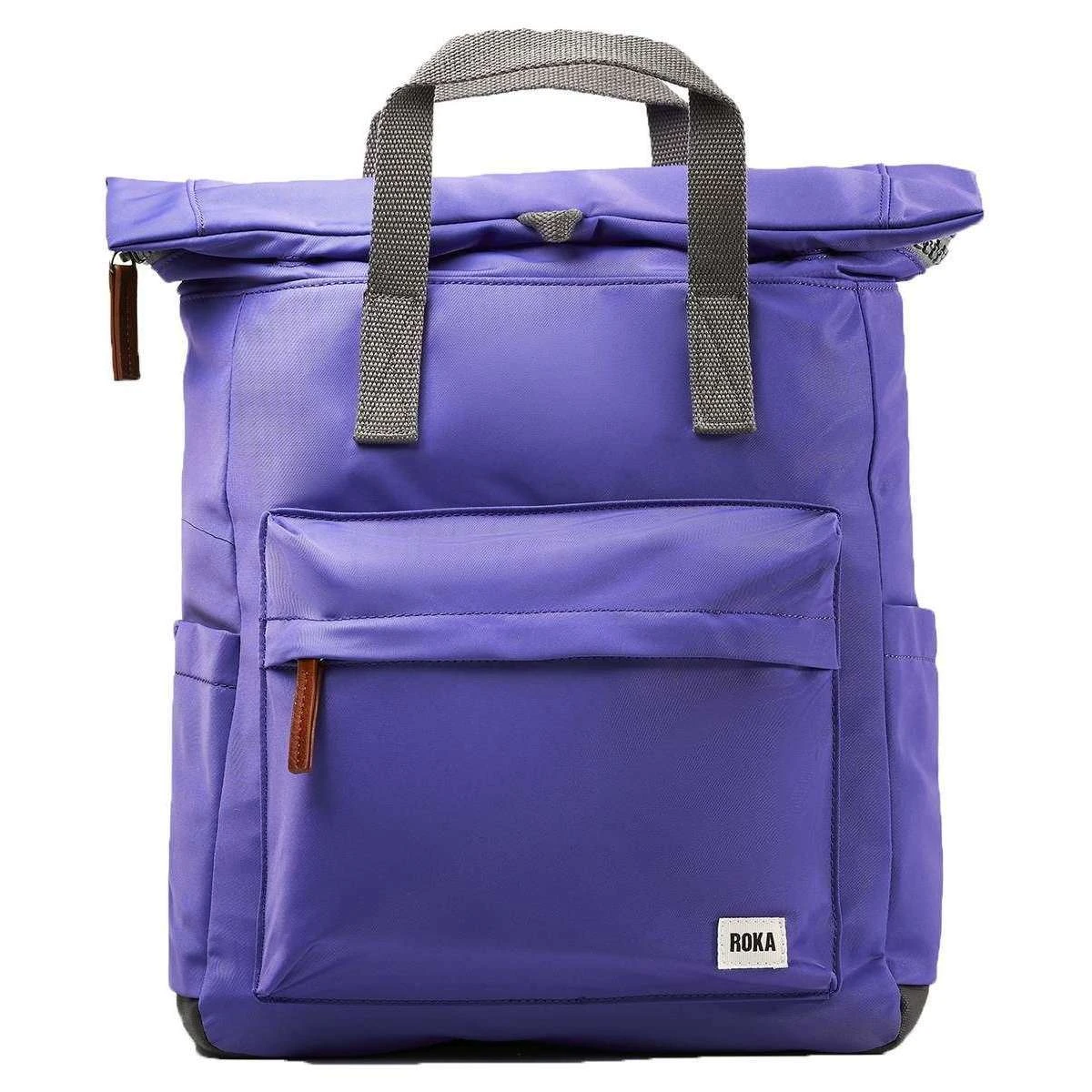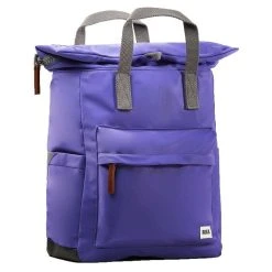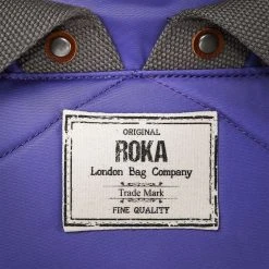 This unisex canfield b medium sustainable nylon backpack by the brand Roka is made from 100% weather resistant recycled nylon (triple coated) and is showcased in purple. It measures 42cm(height) x 30cm(width) x 12cm(depth). All the bags come complete with roka packaging. The Roka Canfield B Medium Sustainable Nylon Backpack – Peri Purple is weather-resistant, durable, lightweight and sleek. Excellently crafted from recycled rPET materials, 12 or more plastic bottles are used to create this backpack making it environmentally friendly and sustainable. The roll top design enables the backpack to have a wide mouth opening which is secured with a sturdy zip and magnetic hold, carrying your essentials couldn’t be safer. Featuring a secret wallet pocket, a padded 15” laptop compartment, two side pockets perfect for water bottles, this backpack allows you to carry everything you may need on your day-to-day travels. Carry in complete comfort with the adjustable cotton webbing straps or the twin carry handles. This bag is completely vegan.