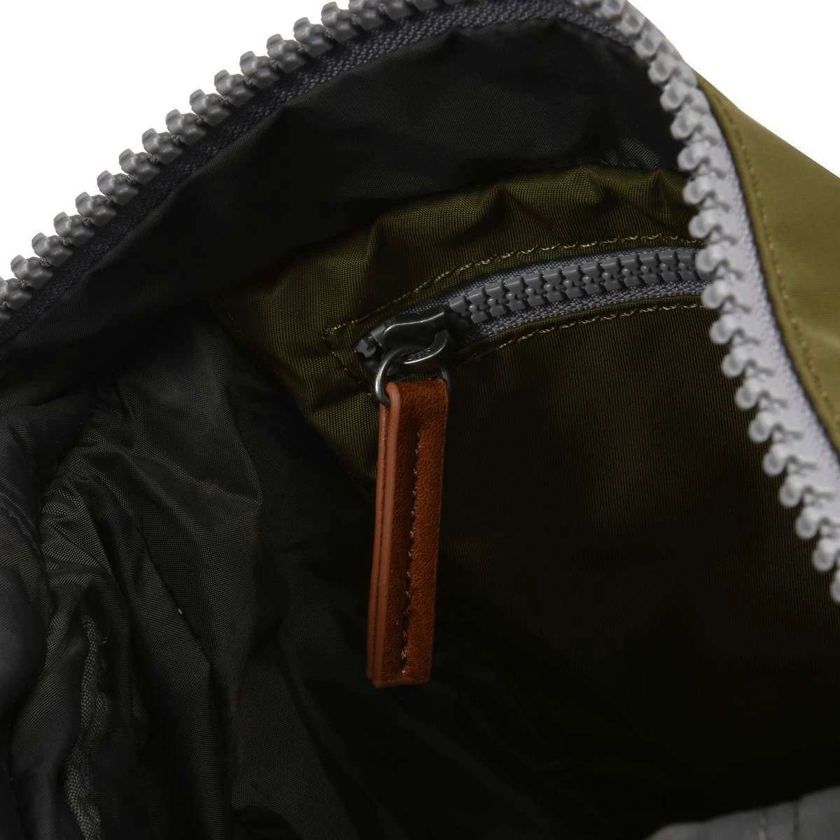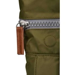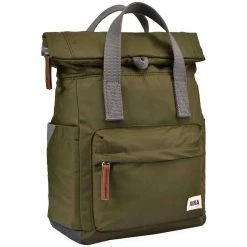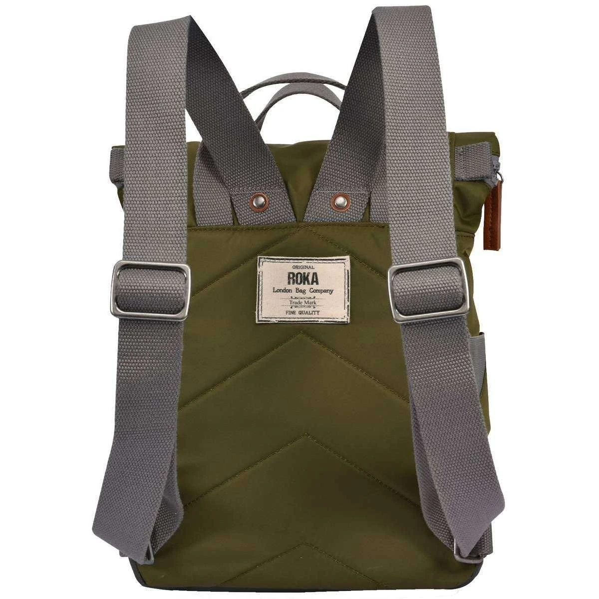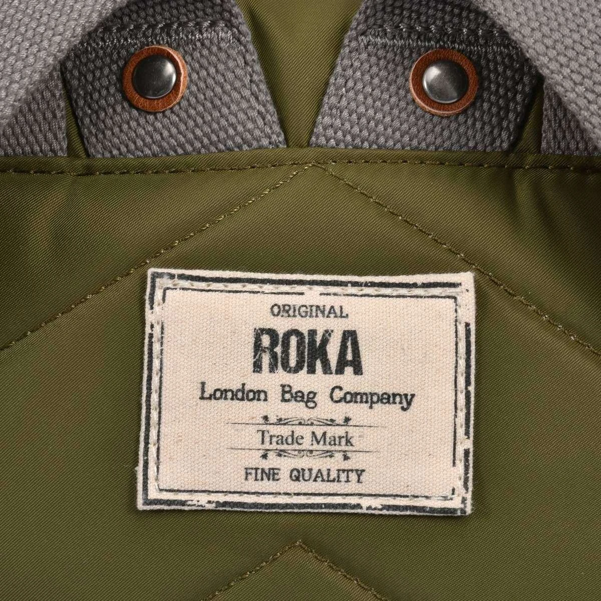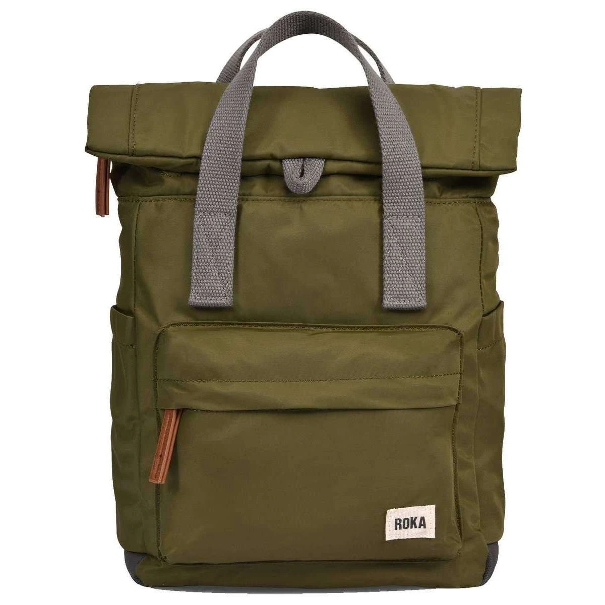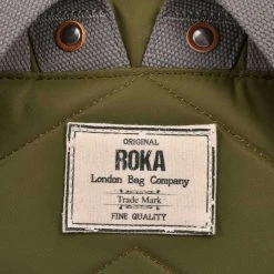 Perfect for men or women is this Roka military green canfield b small sustainable nylon backpack, it is also made from 100% weather resistant recycled nylon (triple coated). It measures 32cm(height) x 23.5cm(width) x 9.6cm(depth). All the bags come complete in roka packaging. The Roka Canfield B Small Sustainable Nylon Backpack – Military Green is weather-resistant, durable, lightweight and sleek. The roll top design enables the backpack to have a wide mouth opening which is secured with a sturdy zip and magnetic hold, carrying your essentials couldn’t be safer. Featuring a secret wallet pocket and a tablet section, this backpack allows you to carry everything you may need on your day-to-day travels. Carry in complete comfort with the adjustable cotton webbing straps or the twin carry handles. 12 or more plastic bottles are used to make the rPET material for this bag so it is environmentally friendly and also completely vegan.