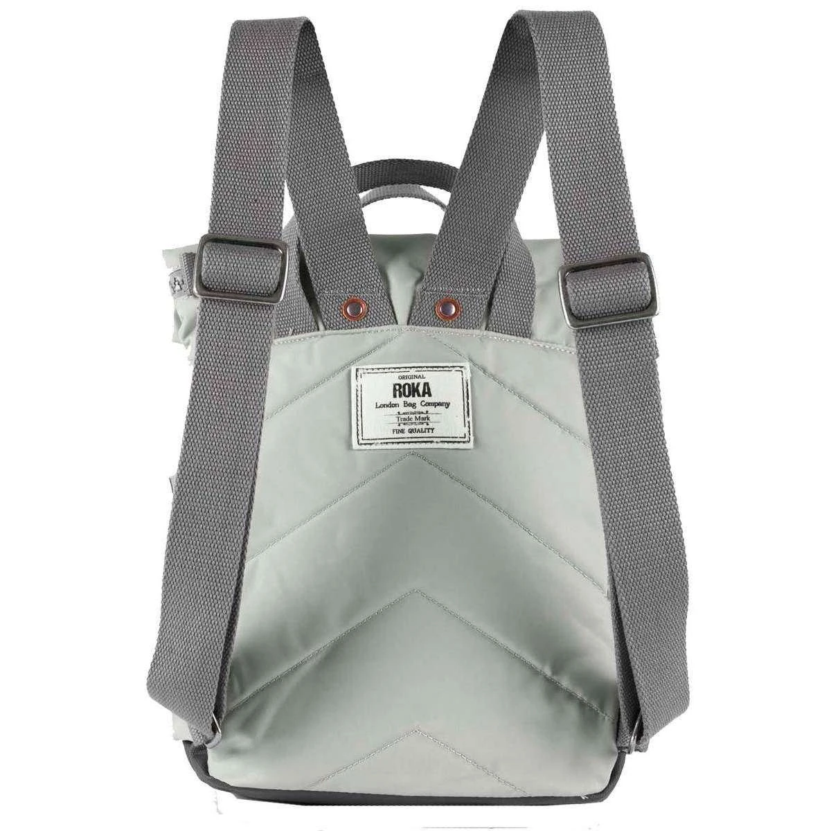 Brought to you by the brand Roka, this mist grey unisex canfield b small sustainable nylon backpack is made from 100% weather resistant recycled nylon (triple coated). It measures 32cm(height) x 23.5cm(width) x 9.6cm(depth). All the bags come complete with roka tags. The Roka Canfield B Small Sustainable Nylon Backpack – Mist Grey is weather-resistant, durable, lightweight and sleek. The roll top design enables the backpack to have a wide mouth opening which is secured with a sturdy zip and magnetic hold, carrying your essentials couldn’t be safer. Featuring a secret wallet pocket and a tablet section, this backpack allows you to carry everything you may need on your day-to-day travels. Carry in complete comfort with the adjustable cotton webbing straps or the twin carry handles. 12 or more plastic bottles are used to make the rPET material for this bag so it is environmentally friendly and also completely vegan.