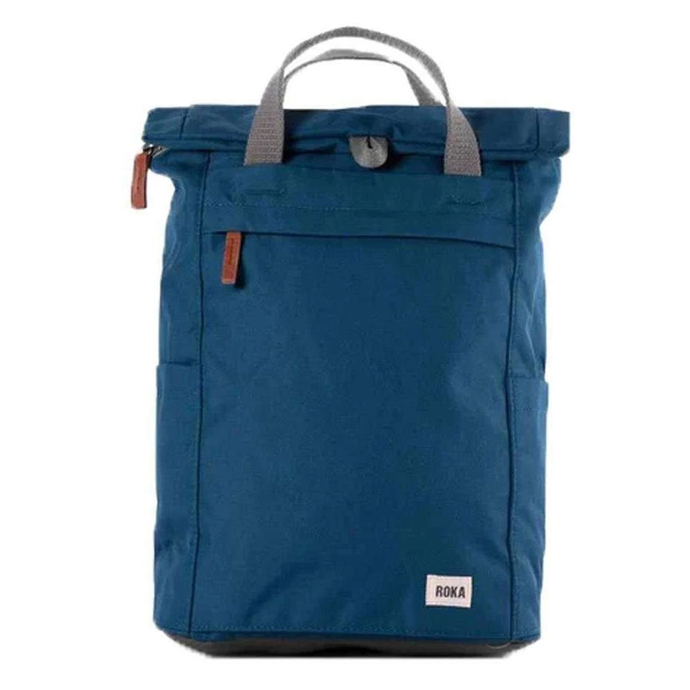 This unisex finchley a medium sustainable canvas backpack by the brand Roka is made from 100% weather resistant recycled canvas (triple coated) and is showcased in blue. It measures 42cm(height) x 28cm(width) x 13cm(depth). All the bags come complete with roka packaging. The Roka Finchley A Medium Sustainable Canvas Backpack – Marine Blue holds and organises an impressive number of items, all within the roll-top design. Water-resistant and crafted from rPet materials, this backpack is sustainable, vegan and kind to the environment. There is a lightly padded laptop pocket that will fit your devices up to 17″ and the extra storage space holds a change of clothes, water bottle, snacks and more! The zip pocket on the front is perfect for things you need to access quickly whilst on the move. The back padding and cotton straps provide comfort to the back and shoulders for comfortable carrying, perfect for everyday use.