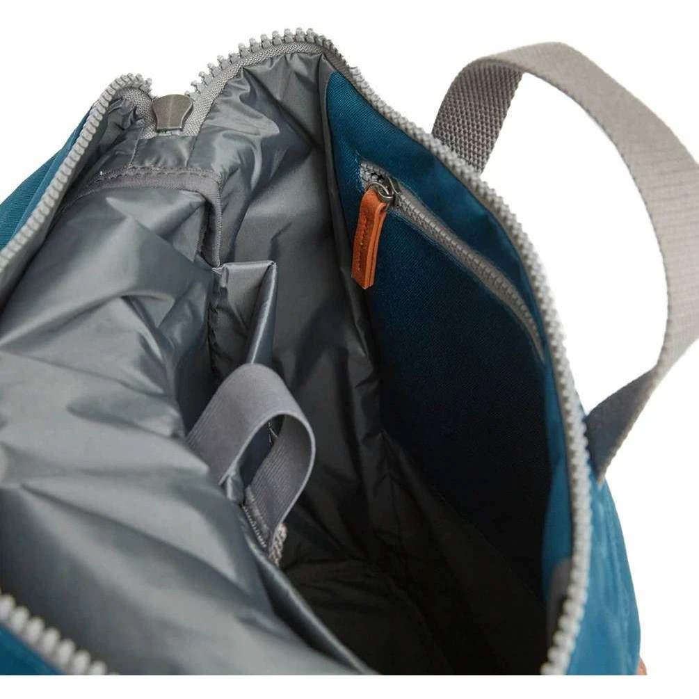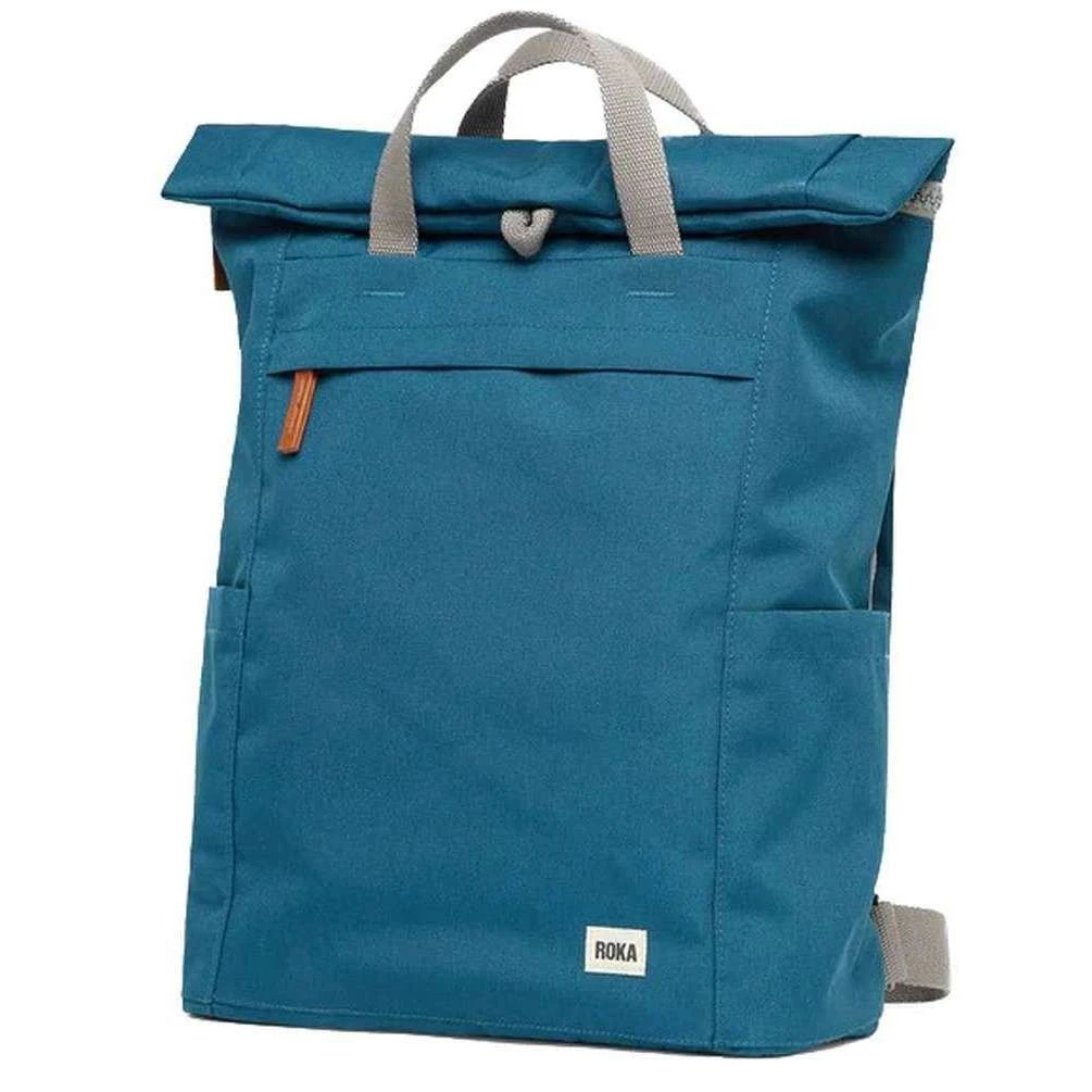 Designer Roka has brought you this unisex 100% weather resistant recycled canvas (triple coated) bag using marine blue tones. It measures 42cm(height) x 28cm(width) x 13cm(depth). All the bags come complete with roka biodegradable packaging. The Roka Finchley A Small Sustainable Canvas Backpack – Marine Blue is weather resistant and has all the space you would need for an everyday backpack. Made from PET this bag has matte look and feel which helps to evoke the canvas. PET material is used in plastic bottles which usually ends up in landfill or in the ocean, but it has been recycled to give the material new life and protect oceans. You can store a range of items from your gym clothes to a 17” laptop as there is a padded sleeve to protect it and a range of side and zipped pockets. With a lightly padded back and adjustable straps, this backpack is a fantastic design.