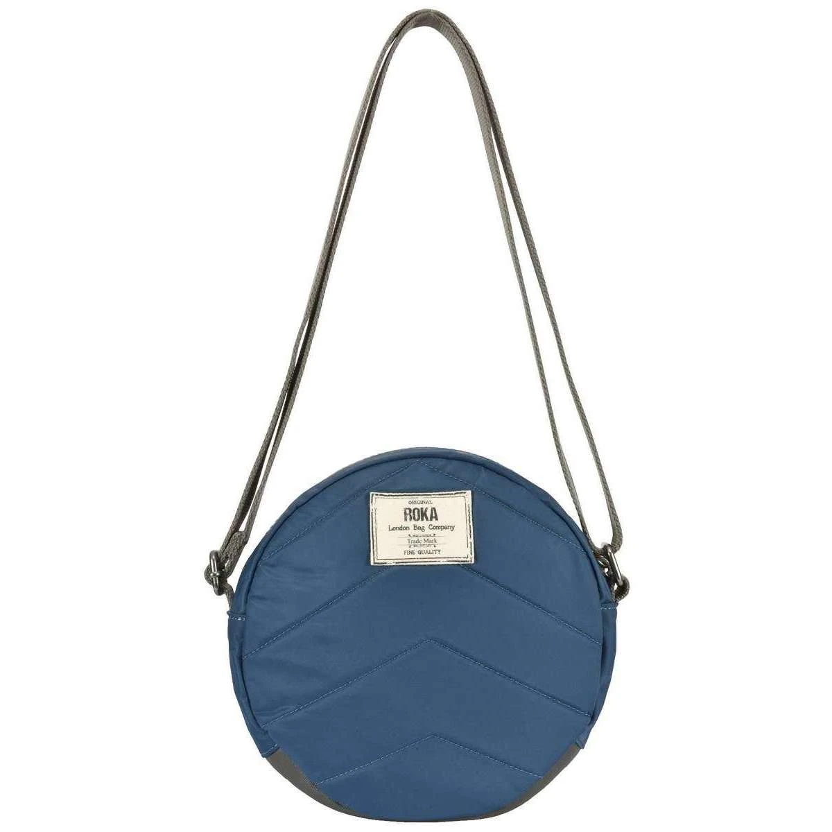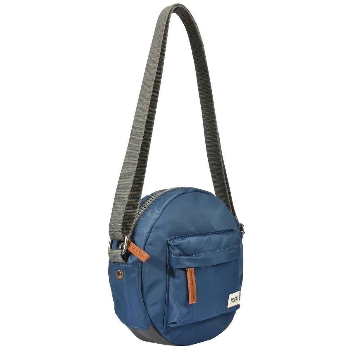 Manufactured from 100% weather resistant recycled nylon (triple coated) is this pacific blue unisex paddington b small sustainable nylon crossbody bag by the designer Roka. It measures 23cm(height) x 23cm(width) x 7cm(depth). All the bags come complete in roka packaging. The Roka Paddington B Small Sustainable Nylon Crossbody Bag – Pacific Blue is the perfect round bag that suits any style! Extremely practical and comfortable, this design features three pockets and a sectional organiser to keep your items safe and secure. The front pocket with zipper makes finding important things like wallet and keys faster! Being water-resistant and durable, this elegant crossbody bag will be an indispensable accessory of your daily life! Twelve or more plastic bottles are used to make the rPet Materials used in the construction of this bag so you can be sure it is sustainable, environmentally friendly and vegan.