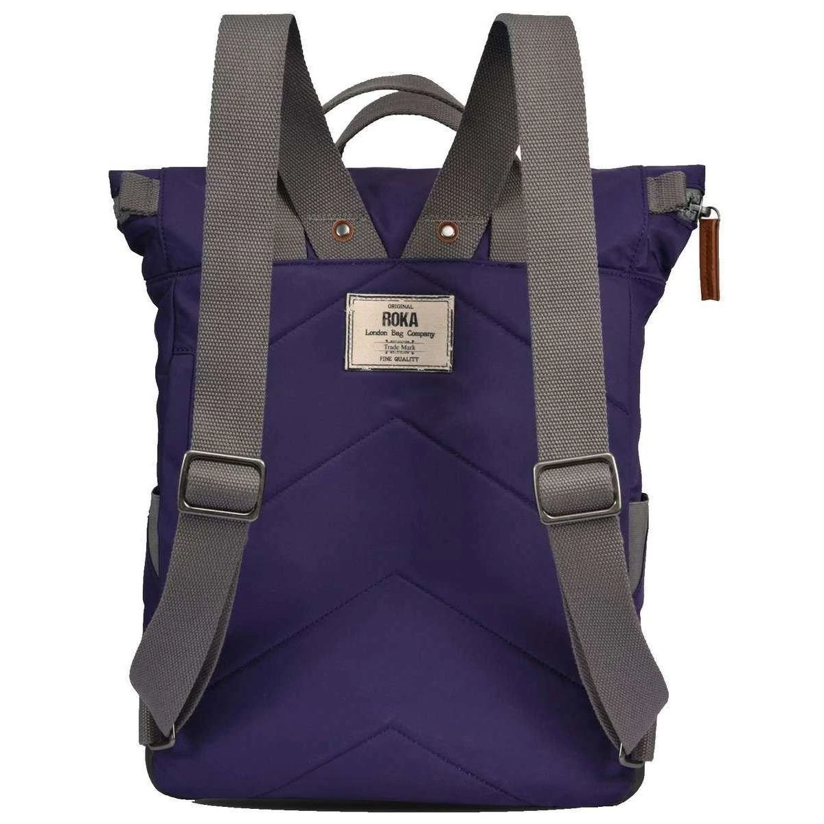 Manufactured from 100% weather-resistant recycled nylon (triple coated) is this mulberry purple unisex canfield b medium sustainable nylon backpack by the designer Roka. It measures 42cm(height) x 30cm(width) x 12cm(depth). All the bags come complete in roka packaging. The Roka Canfield B Medium Sustainable Nylon Backpack – Mulberry Purple is weather-resistant, durable, lightweight and sleek. Excellently crafted from recycled rPET materials, 12 or more plastic bottles are used to create this backpack making it environmentally friendly and sustainable. The roll top design enables the backpack to have a wide mouth opening which is secured with a sturdy zip and magnetic hold, carrying your essentials couldn’t be safer. Featuring a secret wallet pocket, a padded 15” laptop compartment, two side pockets perfect for water bottles, this backpack allows you to carry everything you may need on your day-to-day travels. Carry in complete comfort with the adjustable cotton webbing straps or the twin carry handles. This bag is completely vegan.